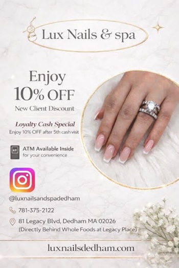 LUX NAILS AND SPA 81 LEGACY BLVD, DEDHAM, MA 02026 |
